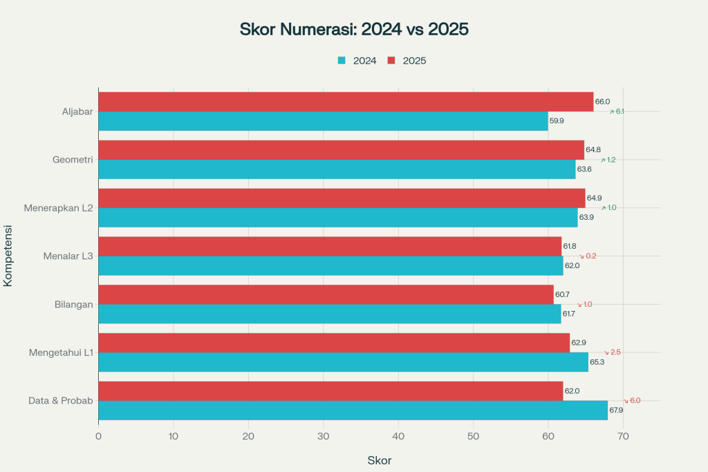 Kompetensi Bilangan mengalami penurunan minor dari 61,69 menjadi 60,70 (turun 0,99 poin atau 1,60%). Ini menunjukkan: