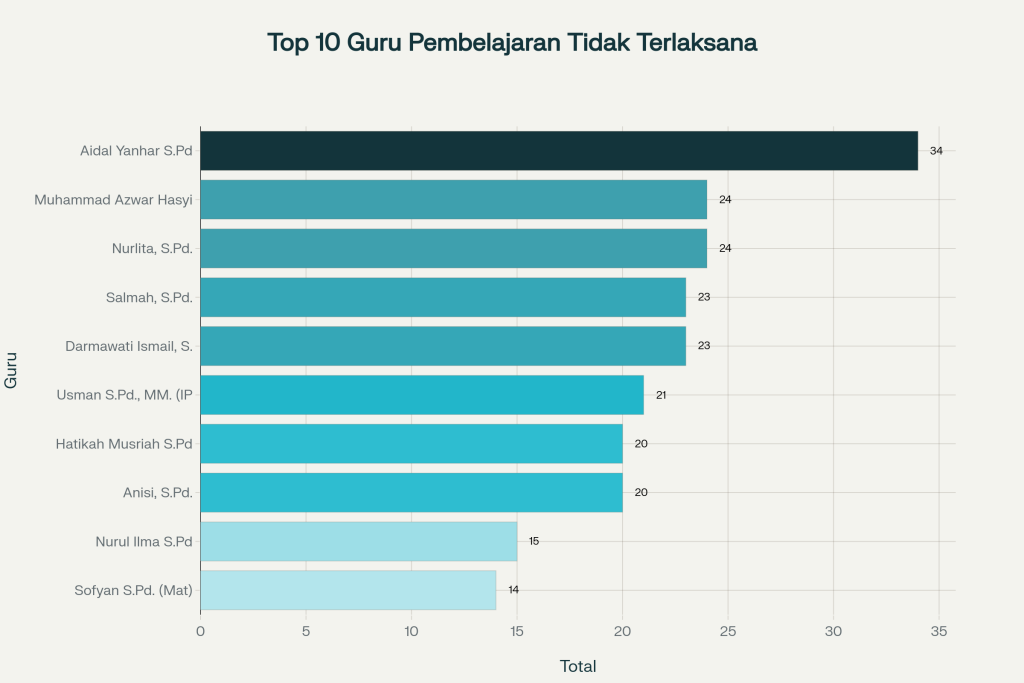 Lima guru dengan pembelajaran tidak terlaksana terbanyak menunjukkan pola distribusi horizontal yang luas. Nurlita S.Pd (Seni Budaya) dan Muhammad Azwar Hasyim S.Pd (IPS Terpadu) masing-masing 24 pertemuan, Darmawati Ismail S.Pd.I (PAI) 23 pertemuan, dan Salmah S.Pd (IPA) 23 pertemuan. Keempat guru ini mengajar di multiple rombongan belajar, mengindikasikan kompleksitas pengelolaan jadwal dan beban mengajar sebagai faktor kontributif.