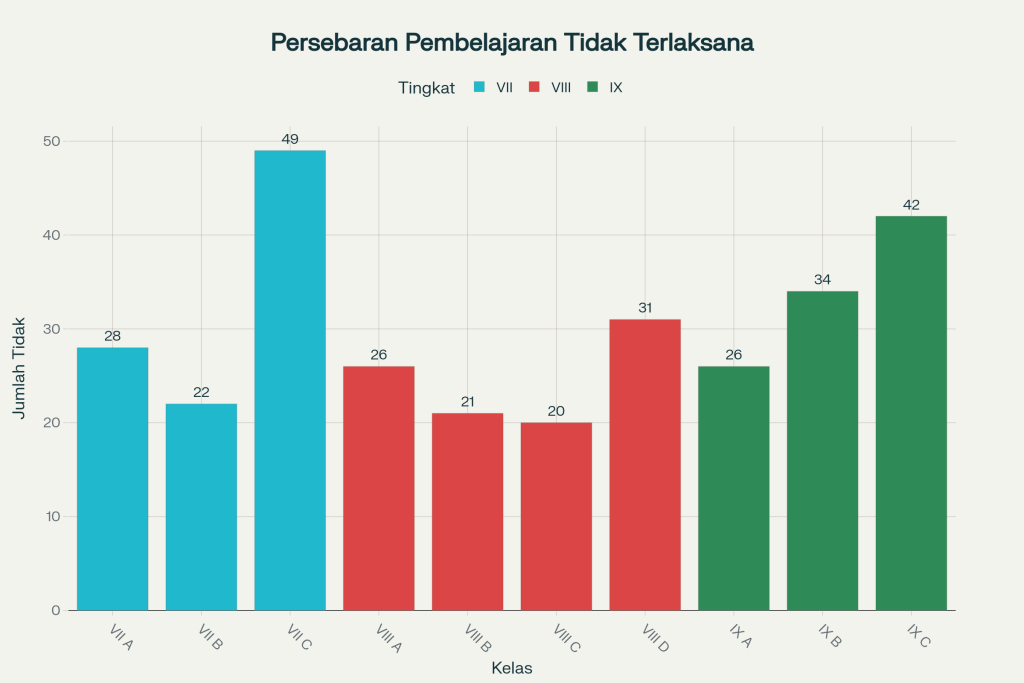 Namun, ketika dianalisis per kelas, muncul disparitas yang signifikan. Analisis Kelas VII C mencatat rekor tertinggi dengan 49 pertemuan tidak terlaksana (16,4% dari total), hampir dua kali lipat dari kelas dengan masalah teringan (VIII C dengan 20 pertemuan). Kesenjangan 29 pertemuan antara kelas tertinggi dan terendah mengindikasikan inkonsistensi pengelolaan pembelajaran antar rombongan belajar.
