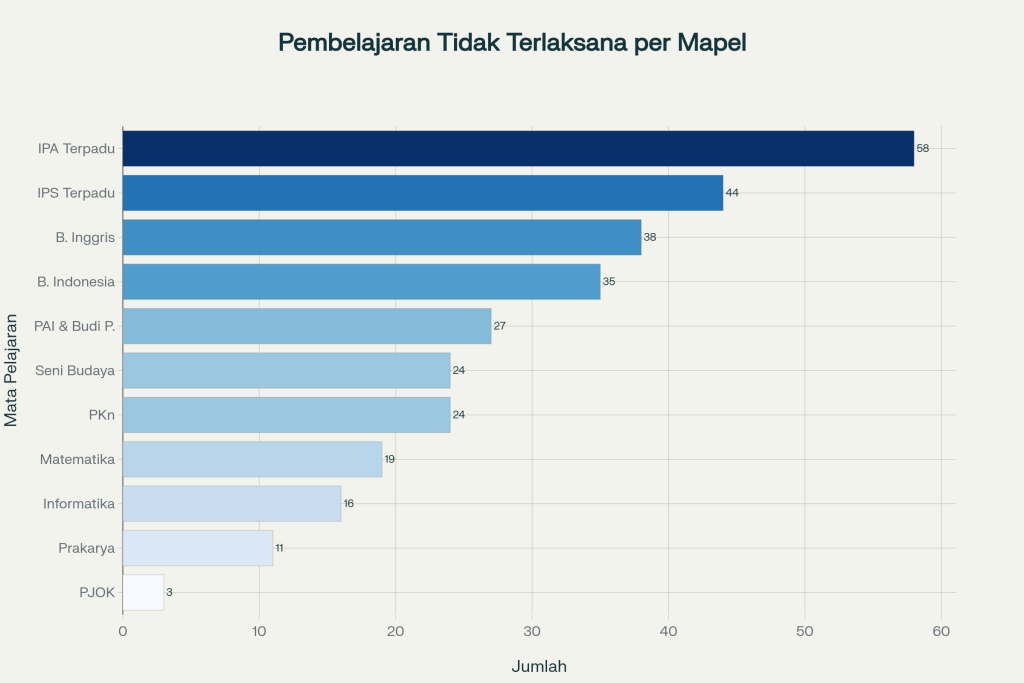 IPA Terpadu mendominasi dengan 58 pertemuan tidak terlaksana (19,4%), diikuti IPS Terpadu dengan 44 pertemuan (14,7%), dan Bahasa Inggris dengan 38 pertemuan (12,7%). Analisis Tiga mata pelajaran ini menyumbang 46,8% dari total pembelajaran tidak terlaksana, menunjukkan konsentrasi masalah pada rumpun tertentu.
