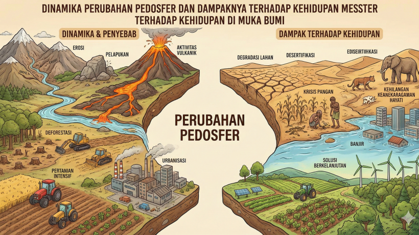 Dinamika Perubahan Pedosfer dan Dampaknya terhadap Kehidupan di Muka Bumi. Tanah merupakan permukaan bumi yang dapat dipergunakan untuk berbagai macam keperluan, antara lain, tempat mendirikan perumahan, pertanian dan perkebunan, dan bahan pembuat berbagai macam bahan bangunan. Dapatkah kalian bayangkan bagaimana jika bumi tidak memiliki tanah? Di mana manusia dan hewan akan berpijak? Di mana tanaman akan tumbuh? Tidak dapat dibayangkan apa yang akan terjadi jika tidak ada tanah di muka bumi ini.