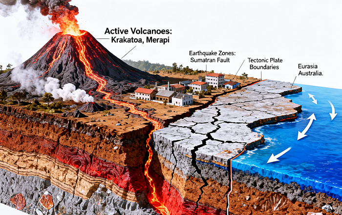 Busur gunung-gunung api Indonesia terbentuk karena ketika pinggiran lempengan India-Australia bertabrakan dengan lempengan Eurasia, lempengan tersebut longsor jauh ke dalam bumi, dan temperatur yang sangat tinggi telah melelehkan pinggiran lempengan sehingga menghasilkan magma. Magma ini kemudian muncul melalui retakan-retakan di banyak tempat pada permukaan bumi yang membentuk jajaran gunung api. Gunung berapi yang terbentuk dengan cara ini disebut gunung api andesit. Gunung api andesit bersifat mudah meledak dan tak terduga, dan lava yang dikeluarkan membentuk batuan andesit.