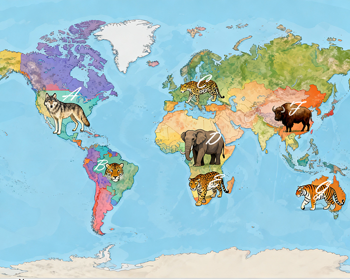 Berdasarkan peta diatas sebutkan nama pembagian karakteristik masing-masing hewan di Dunia Menurut Alfred Russel Wallace yang ditandai dengan huruf A, B, C, D, E, F, G.
